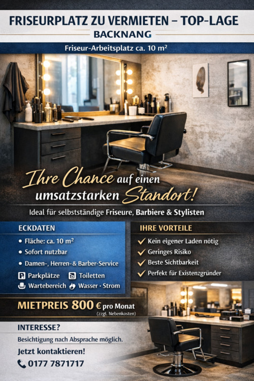 Zur Vermietung steht ein Friseur-Arbeitsplatz (ca. 10 m²) in sehr guter Lage in Backnang.