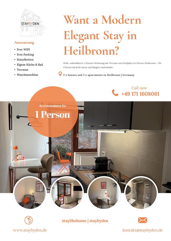 Vermietet wird eine vollmöblierte 1-Zimmer-Wohnung im Zentrum von Heilbronn, ideal für 1-Person, mit TV, eine voll ausgestattete Küche sowie ein Bad mit Dusche und WC sowie ein Balkon mit Grillbereich.